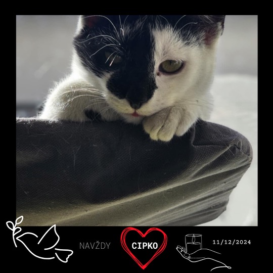Krásneho a veľmi milého kocúrika menom Cipko nám priniesli v jeho najťažšom okamihu, keď bol zranený a vystrašený, pretože ho napadol pes, ktorý mu spôsobil značné trápenie a utrpenie. Hneď, ako sme ho zbadali, okamžite sme si ho obľúbili pre jeho hravú a nežnú povahu, ktorá aj napriek bolesti a strachu vyžarovala z neho radiáciu lásky a dôvery. Tragicky, nielenže mal rany z útoku, ale neskôr sa u neho objavili aj vážne zdravotné problémy s pečeňou, ktoré sa ukázali byť smrteľné a nanešťastie jeho boj o život skončil porážkou. Teraz, keď už nie je medzi nami, tisíckrát opakujeme, že odpočívaj v pokoji, drahý Cipko, lebo si zaslúžiš všetku lásku a pokoj, ktorý ti už nikto nemôže vziať.